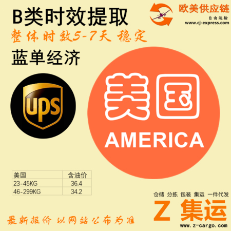 大陆UPS蓝单经济时效 5-7天 B类提取时效 46-299KG 34.2/KG